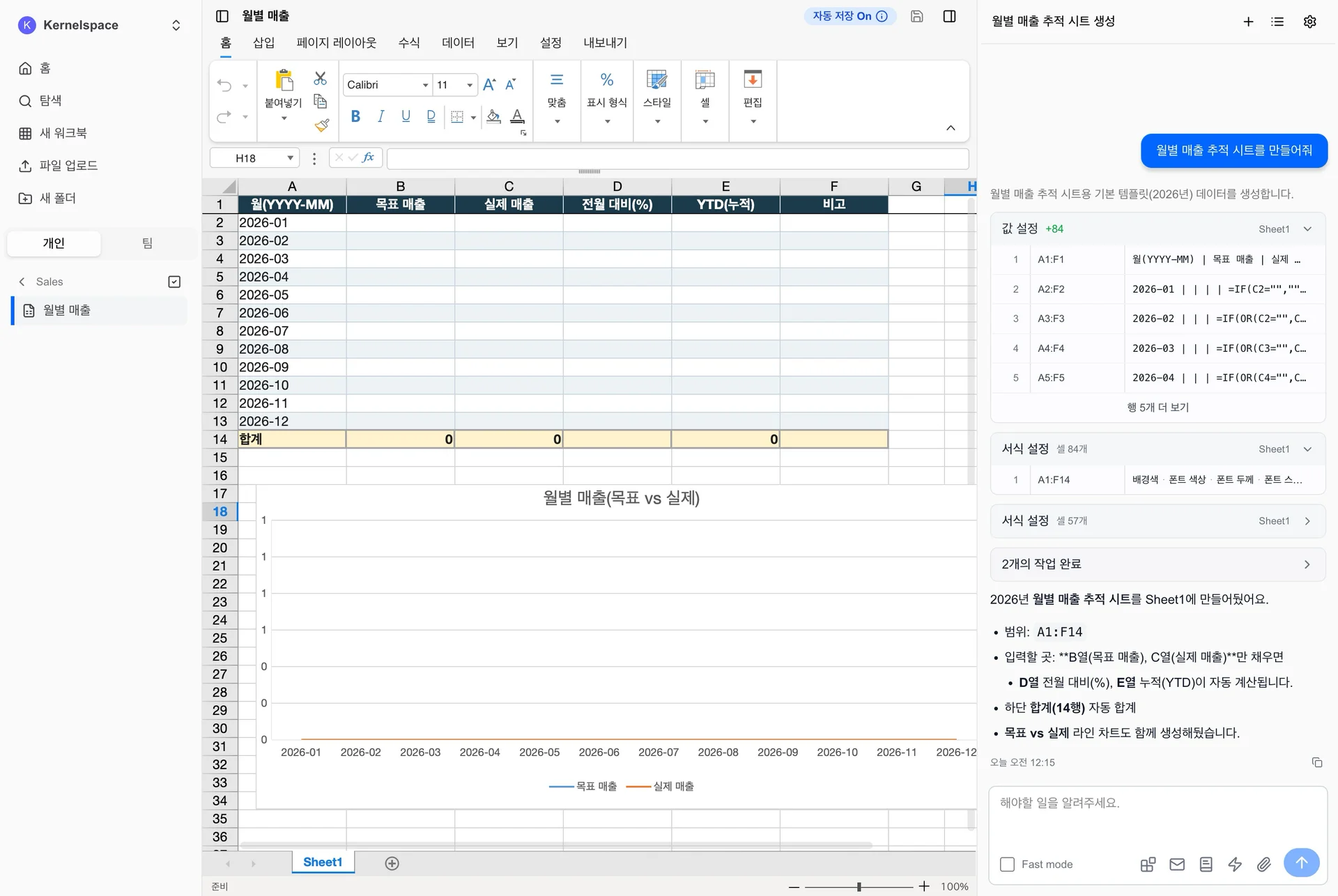 사용자는 논리를 코드나 함수로 작성하지 않아도 됩니다. 의도를 말하면 됩니다. AI가 그 의도를 분석하고, 논리로 만들고, 입력할 값을 모아서 한 번에 작성합니다.