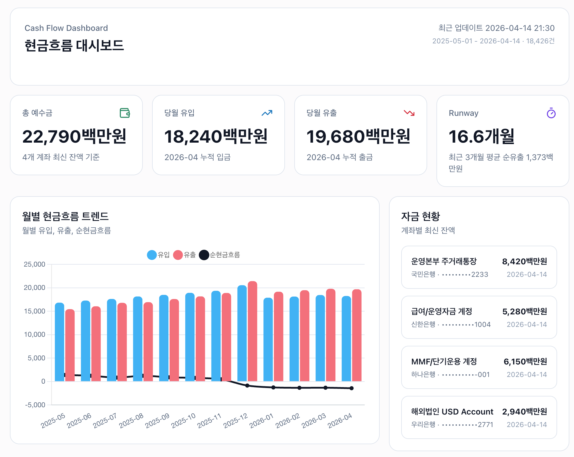 자금 현황, 월별 현금흐름, runway, 주요 지출 항목을 한 번에 확인할 수 있습니다.