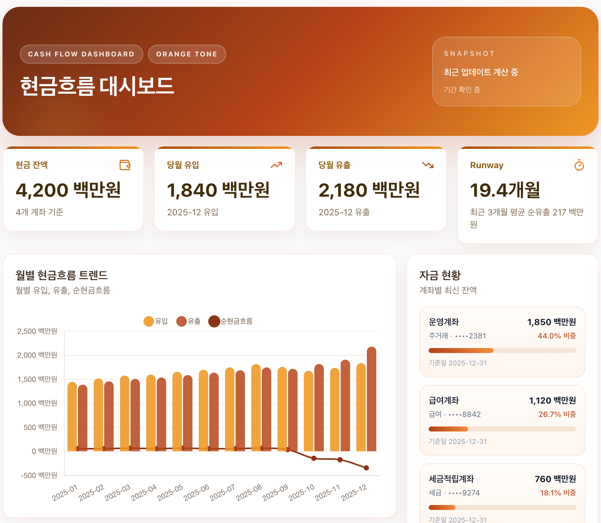 자금 현황, 월별 현금흐름, runway, 주요 지출 항목을 한 번에 확인할 수 있습니다.